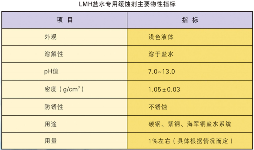 LMH鹽水專用緩蝕劑是用于氯化鈣溶液、氯化鈉溶液及其他氯化物鹽溶液的緩蝕劑,可廣泛用于鹽水制冷系統(tǒng),也可用于其他使用鹽水的環(huán)境,如鹽水鉆井液等,與鹽水溶性良好,適用于碳鋼、紫銅、黃銅等多種材質系統(tǒng)。根據(jù)具體情況需定期少量補加,防銹性優(yōu)良,使用方便。