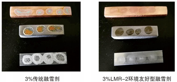 3、防腐蝕性能好,采用M3超膜防銹技術(shù),對(duì)碳鋼、銅、鋁合金等金屬幾乎不腐蝕:對(duì)瀝青、混凝土路面腐蝕較小。LMR-2融雪劑防銹性能見(jiàn)下圖。
