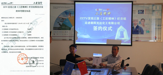 我公司提交的CCTV發(fā)現(xiàn)之旅《工匠精神》資料通過(guò)審核,5月11日收到CCTV發(fā)現(xiàn)之旅終審告知函,欄目組于5月17日來(lái)我公司進(jìn)行實(shí)地考察并舉行了簽約儀式!