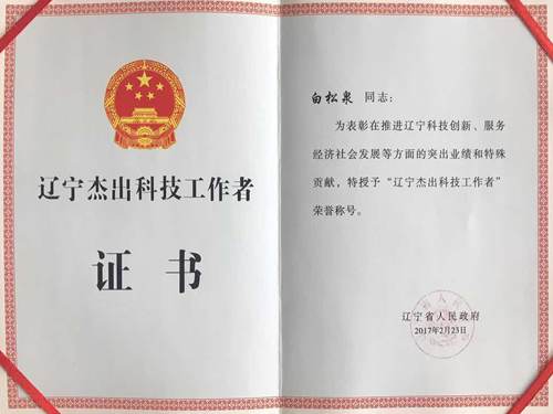 白松泉榮獲“遼寧省杰出科技工作者”榮譽(yù)稱號(hào)
